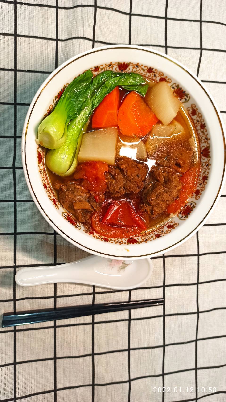 【清燉素牛肉湯】 準備食材: (1)紅蘿蔔、白蘿蔔、牛蕃茄、青江菜 (2)素牛肉片、奇香素肉骨茶2小包 (3)素蠔油(1小匙)、醬油(1小匙)、鹽巴(適量) 料理步驟: (1)將1500CC的水煮開放置肉骨茶湯包煮半小時悶住浸泡. (2)將紅白蘿蔔削皮切滾刀塊、番茄切塊後再準備另一鍋1000CC的滾水煮20分鐘.後把肉骨茶湯倒入一起再放入素牛片與調味的部分煮10分鐘就完成清甜爽口的素牛肉湯. (3)上桌前別忘了再川燙青江菜.擺盤更色香味美喔~