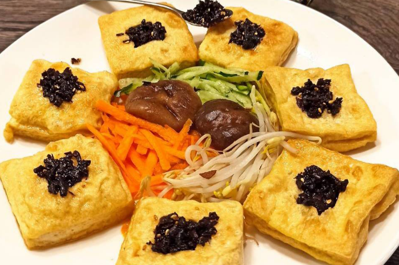 香煎豆腐的酥脆與蔬菜的清爽再搭配古早味的菜脯醬的香鹹,清新不油膩,市一道適合展現廚藝的料理。