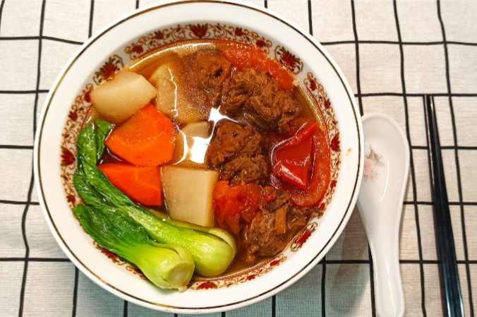 黃金比例調配食材,加入鮮蔬的白蘿蔔、紅蘿蔔等蔬菜慢火細細燉煮出完美琥珀色湯頭,清甜爽口風味獨具。