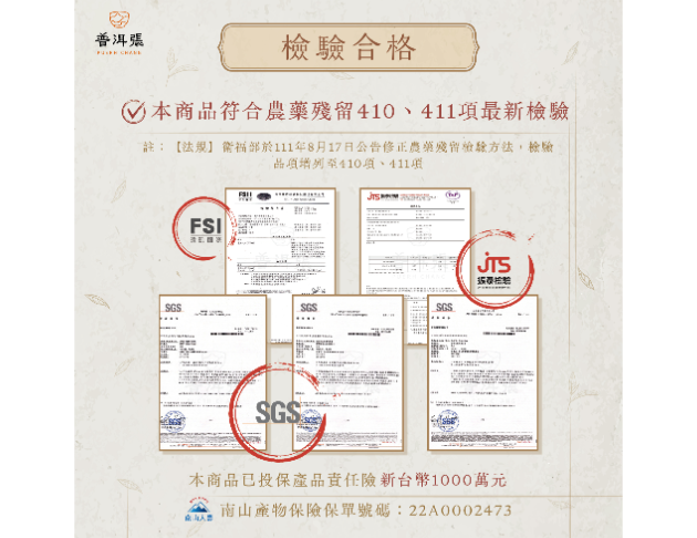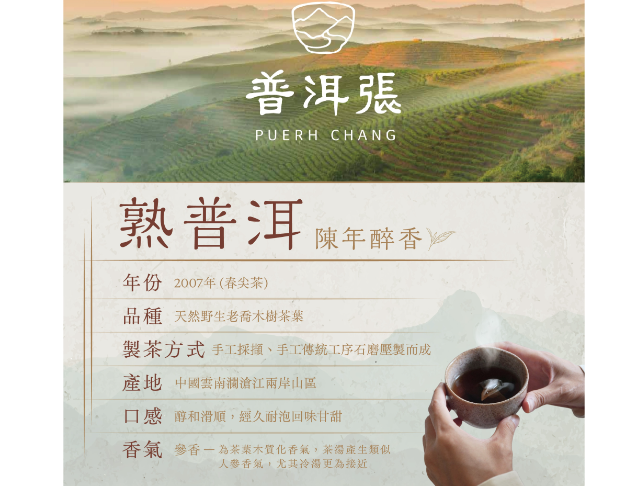 2007年 (春尖茶)天然野生老喬木樹茶葉。 -產地中國雲南瀾滄江兩岸山區。 -手工採擷、手工傳統工序石磨壓製而成。 -口感-參香香氣醇和滑順,經久耐泡回味甘甜。 -無檢出: SGS檢驗合格,無農藥、香料、增色劑、防腐劑。